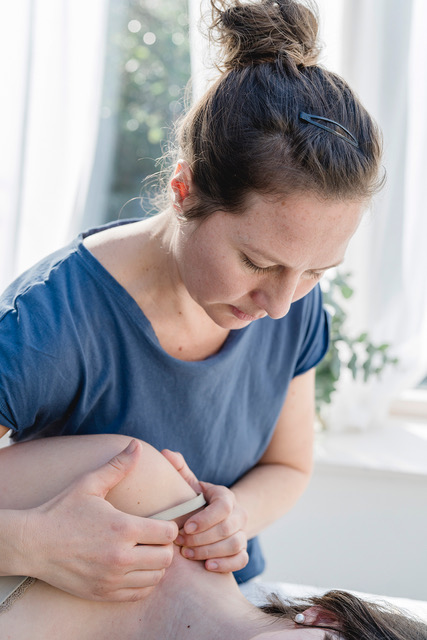 Kinesiotaping ist eine Methode zur Unterstützung von Muskeln, Gelenken und dem Lymphsystem. Dabei werden elastische, hautfreundliche Tapes gezielt auf bestimmte Körperstellen geklebt, um Heilungsprozesse zu fördern, Schmerzen zu lindern und die Beweglichkeit zu verbessern – ohne die Bewegungsfreiheit einzuschränken.Die Tapes wirken über die Haut auf tieferliegende Strukturen und regen u. a. die Durchblutung und den Lymphfluss an.